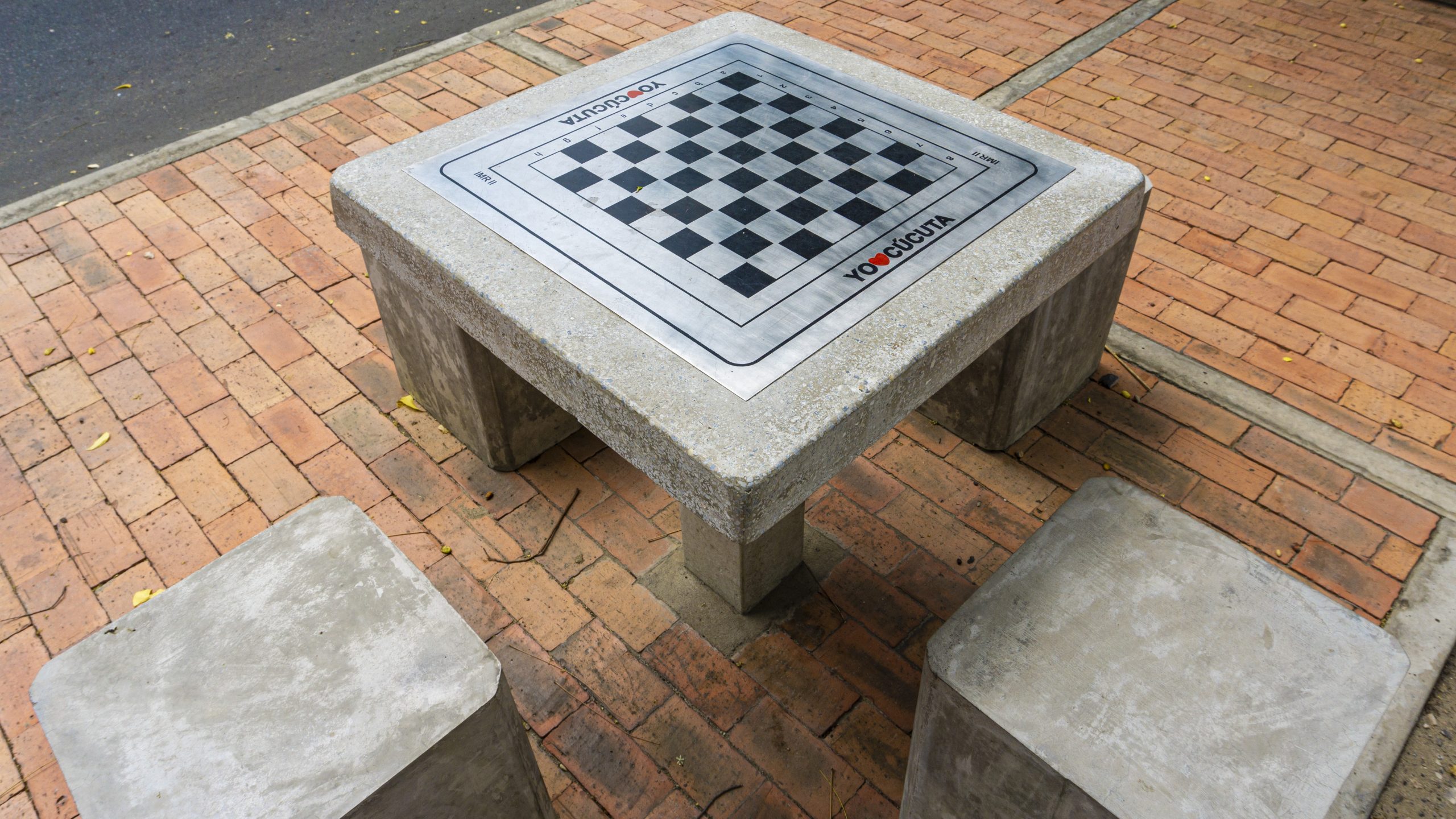 Juego de mesa de ajedrez con 4 butacas en concreto.